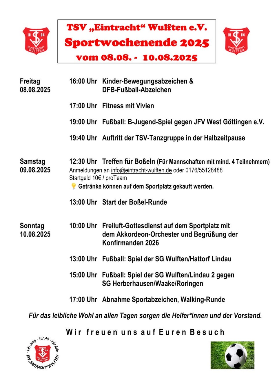 Der Sonntag begann mit einem feierlichen Freiluft-Gottesdienst, musikalisch begleitet vom Akkordeon-Orchester, bei dem auch die Konfirmanden 2026 begrüßt wurden. Danach stand der Fußball im Mittelpunkt: Zunächst spielte die SG Wulften/Hattorf Lindau, bevor die SG Wulften/Lindau 2 gegen die SG Herberhausen/Waake/Roringen antrat.