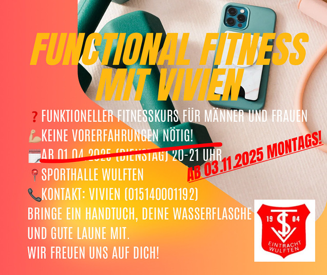Neuer Tag - gleiche Power! Ab dem 03.11.2025 findet unser functional Fitness Kurs immer montags von 20-21 Uhr in der Sporthalle Wulften statt. Starte stark in Deine Woche!
