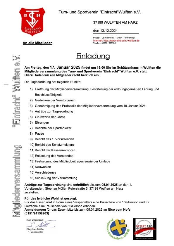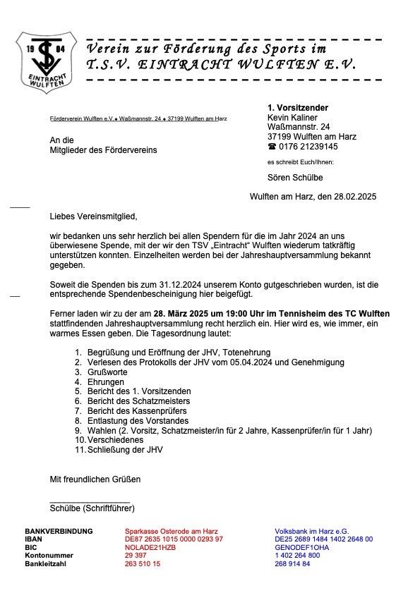 Am Freitag den 28.03.2025 findet um 19:00 Uhr die Jahreshauptversammlung des Verein zur Förderung des Sports im TSV Eintracht Wulften kurz Förderverein statt.